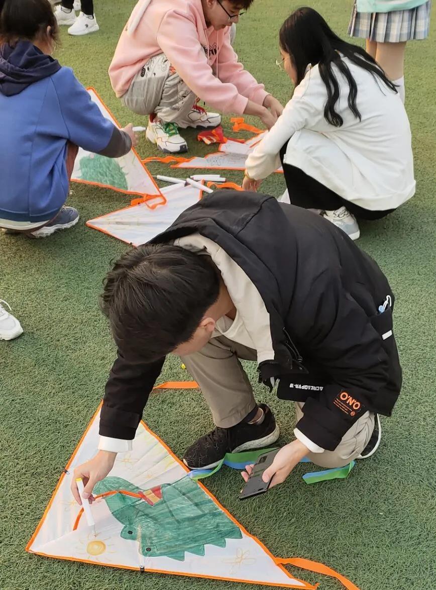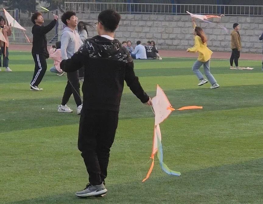 篮球场上,旭日普照之下,同学们或球场你争我夺,或聚焦于天空中飘摇的各色风筝。挥拍、投篮、竞走,在这春日的暖阳下感受运动的快乐,展现青春的风采。